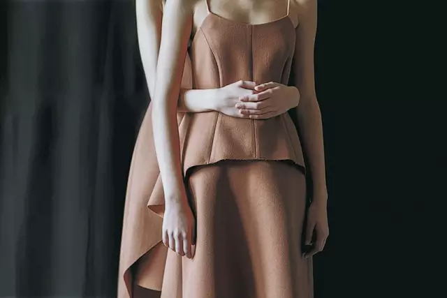 Gayeon Lee for VGRASS此系列中,以上世纪50年代的复古风潮作为灵感来源,用简洁明快的线条勾勒出女性的柔美,立体剪裁的设计修饰了女性身形,对于穿着的造型感也增加了视觉的丰富性,裙摆处的褶皱设计借鉴花瓣的柔美线条,配合高品质的面料达到最完美的结构主义美学。
